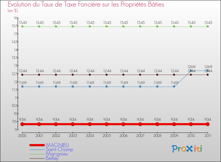 En 2011, le taux de la taxe foncière sur le bâti vôté par le conseil municipal de Magnieu était de : 9.34 %.