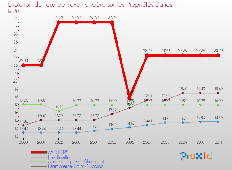 Pendant la même période, les communes françaises similaires à Meulers, ont vu leur taux de taxe foncière sur le bâti augmenter de 23.4 % en moyenne entre 2000 et 2011.