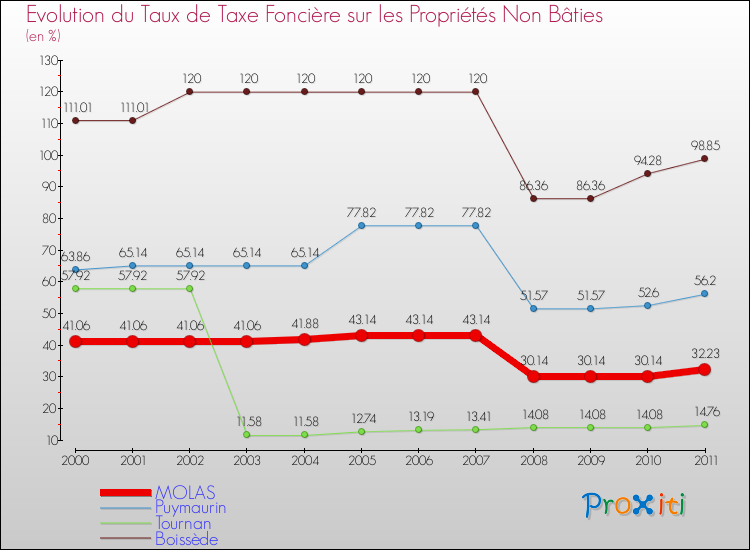 Pendant la même période, les communes françaises similaires à Molas, ont vu leur taux de taxe foncière sur le non bâti baisser de 16.07 % en moyenne entre 2000 et 2011.