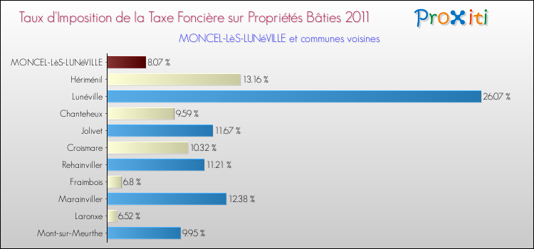 Pendant la même période, les communes françaises similaires à Moncel-lès-Lunéville, ont vu leur taux de taxe foncière sur le bâti augmenter de 34.5 % en moyenne entre 2000 et 2011.