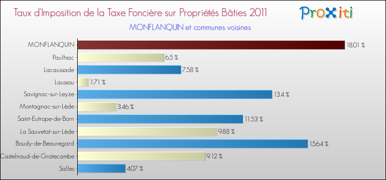 A noter : la valeur moyenne de ce taux de taxe foncière sur le bâti dans les communes françaises similaires à Monflanquin était de 15.13 %, en 2011.