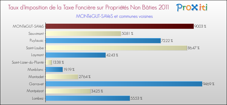 En 2011, le taux de la taxe foncière sur le non bâti vôté par le conseil municipal de Montégut-Savès était de : 90.03 %.