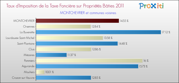 Pendant la même période, les communes françaises similaires à Montchevrier, ont vu leur taux de taxe foncière sur le bâti augmenter de 1.21 % en moyenne entre 2000 et 2011.