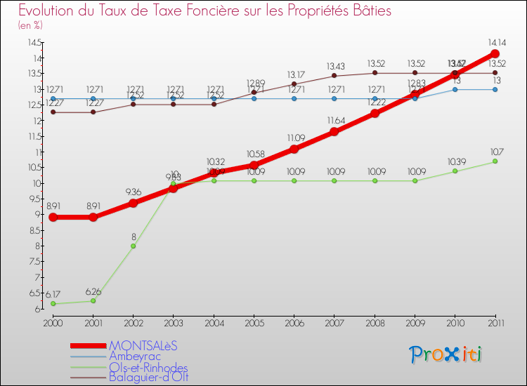A Montsalès, le taux de taxe foncière sur le bâti a donc augmenté de 58.7 % entre 2000 et 2011.