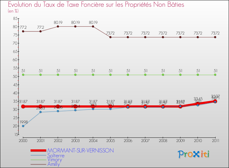 Pendant la même période, les communes françaises similaires à Mormant-sur-Vernisson, ont vu leur taux de taxe foncière sur le non bâti augmenter de 2.96 % en moyenne entre 2000 et 2011.