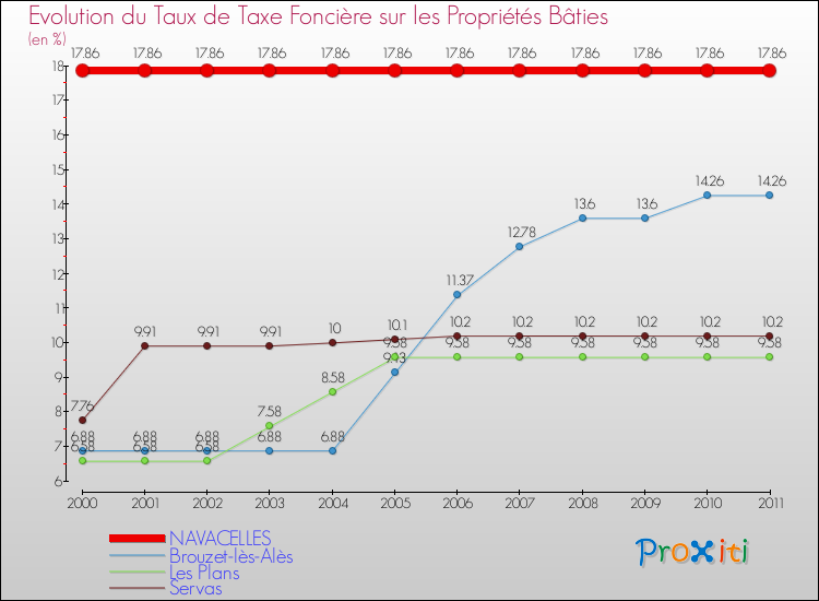 A Navacelles, le taux de taxe foncière sur le bâti a donc augmenté de 0 % entre 2000 et 2011.