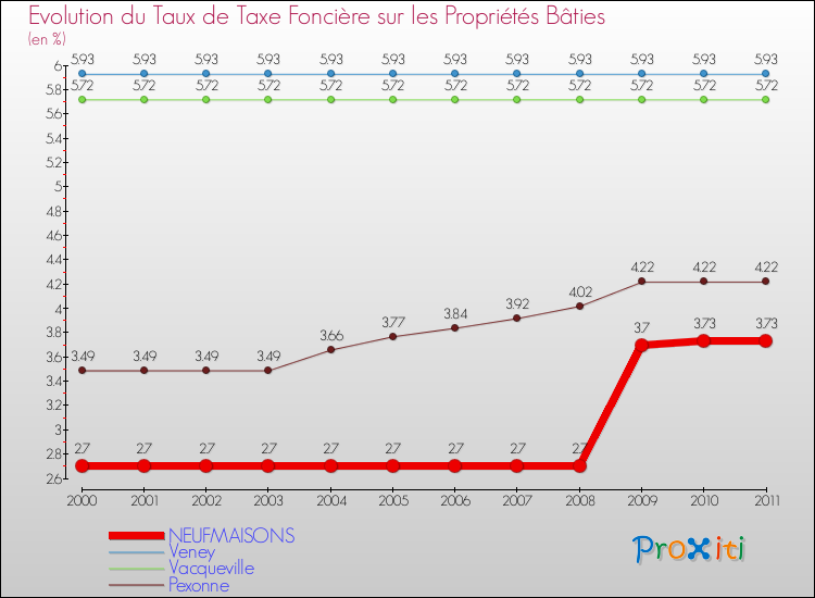 A Neufmaisons, le taux de taxe foncière sur le bâti a donc augmenté de 38.15 % entre 2000 et 2011.