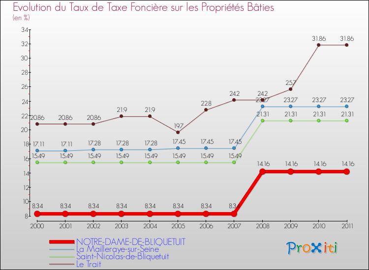 Pendant la même période, les communes françaises similaires à Notre-Dame-de-Bliquetuit, ont vu leur taux de taxe foncière sur le bâti augmenter de 19.31 % en moyenne entre 2000 et 2011.