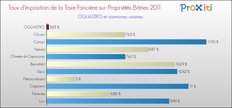 En 2011, le taux de la taxe foncière sur le bâti vôté par le conseil municipal de Ogliastro était de : 3.63 %.