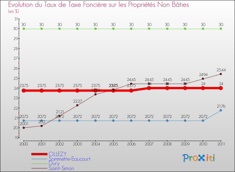 A Ollezy, le taux de taxe foncière sur le non bâti a donc augmenté de 1.05 % entre 2000 et 2011.