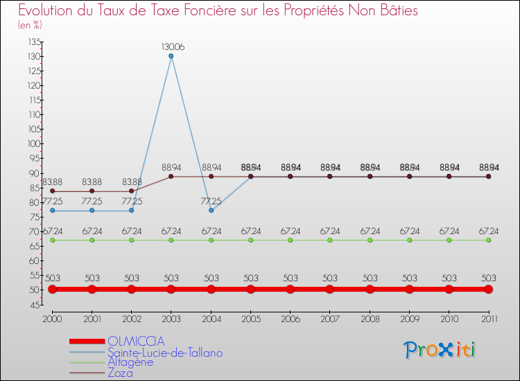 A Olmiccia, le taux de taxe foncière sur le non bâti a donc augmenté de 0 % entre 2000 et 2011.