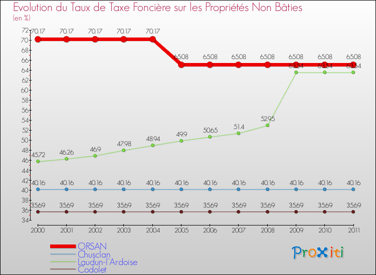 Pendant la même période, les communes françaises similaires à Orsan, ont vu leur taux de taxe foncière sur le non bâti augmenter de 15.45 % en moyenne entre 2000 et 2011.