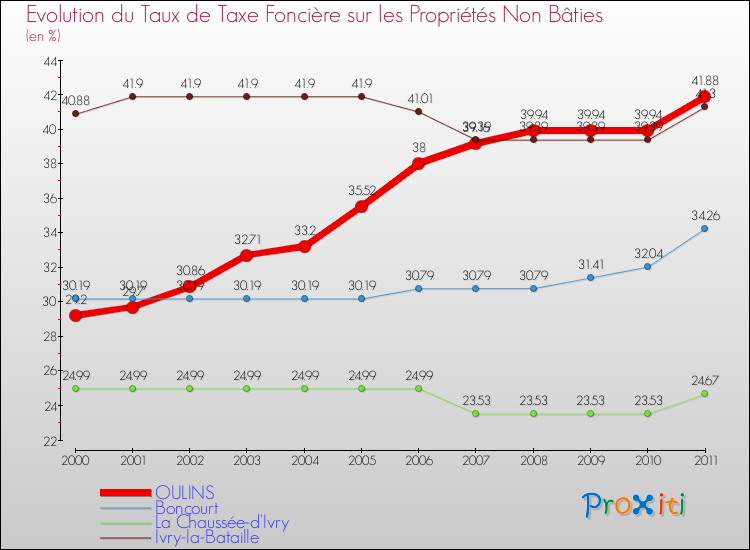 En 2011, le taux de la taxe foncière sur le non bâti vôté par le conseil municipal de Oulins était de : 41.88 %.