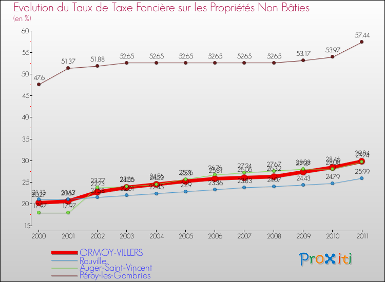 A Ormoy-Villers, le taux de taxe foncière sur le non bâti a donc augmenté de 47.21 % entre 2000 et 2011.