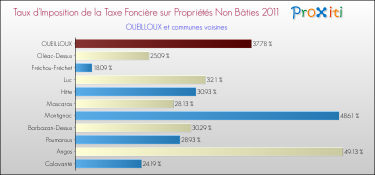 Vous trouverez ci-dessous des graphiques qui vous permettent de situer le taux de la taxe foncière sur le non bâti de Oueilloux par rapport aux communes voisines.