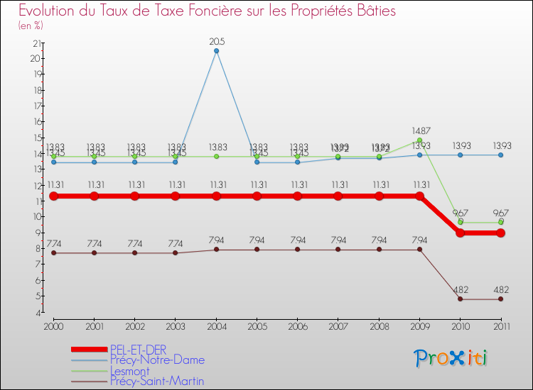 A Pel-et-Der, le taux de taxe foncière sur le bâti a donc baissé de 20.42 % entre 2000 et 2011.