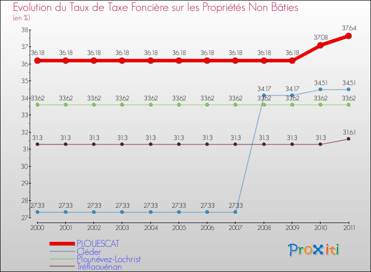 En 2011, le taux de la taxe foncière sur le non bâti vôté par le conseil municipal de Plouescat était de : 37.64 %.