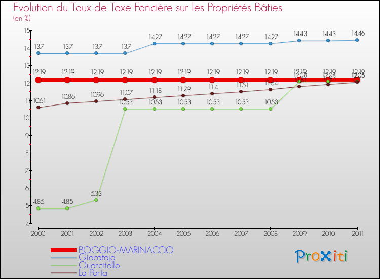 En 2011, le taux de la taxe foncière sur le bâti vôté par le conseil municipal de Poggio-Marinaccio était de : 12.19 %.