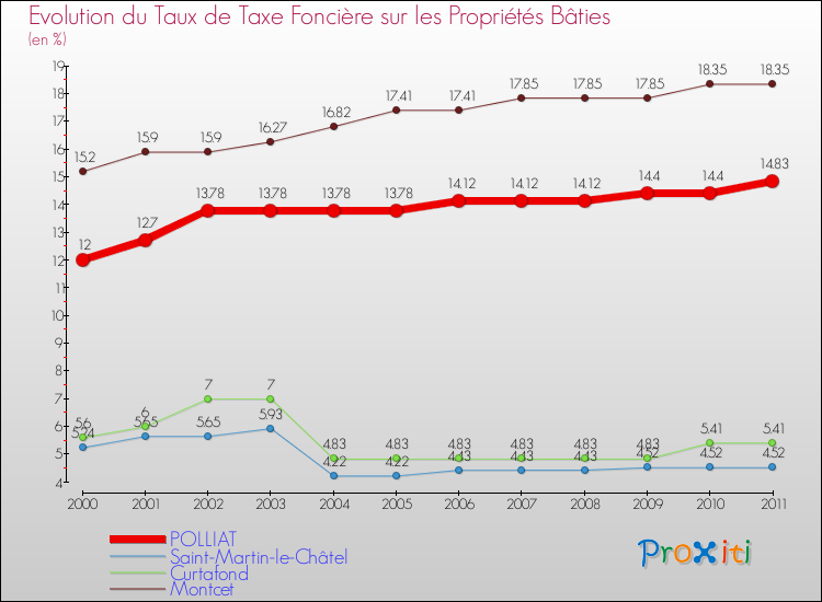 A Polliat, le taux de taxe foncière sur le bâti a donc augmenté de 23.58 % entre 2000 et 2011.
