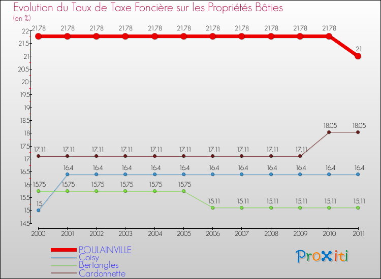 En 2011, le taux de la taxe foncière sur le bâti vôté par le conseil municipal de Poulainville était de : 21 %.