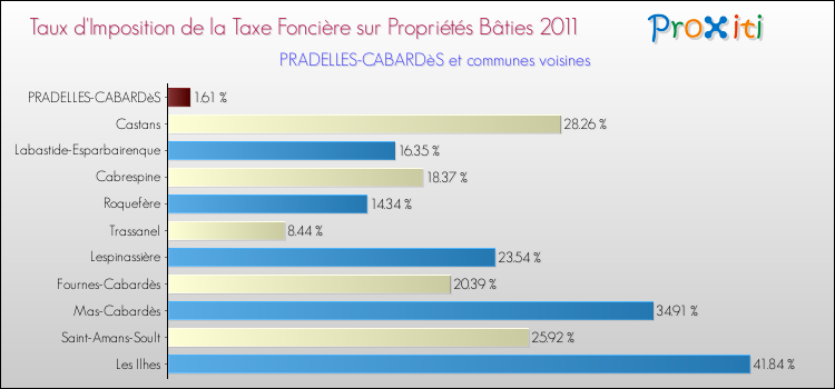 A noter : la valeur moyenne de ce taux de taxe foncière sur le bâti dans les communes françaises similaires à Pradelles-Cabardès était de 10.11 %, en 2011.