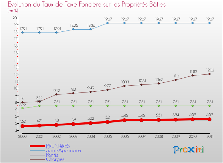 A Prunières, le taux de taxe foncière sur le bâti a donc augmenté de 21 % entre 2000 et 2011.