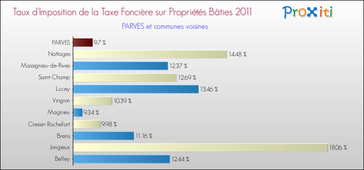 En 2011, le taux de la taxe foncière sur le bâti vôté par le conseil municipal de Parves était de : 9.7 %.