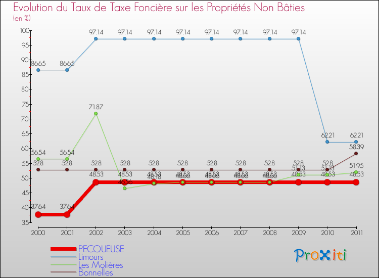 Pendant la même période, les communes françaises similaires à Pecqueuse, ont vu leur taux de taxe foncière sur le non bâti augmenter de 40.51 % en moyenne entre 2000 et 2011.
