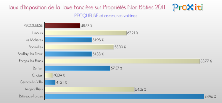 En 2011, le taux de la taxe foncière sur le non bâti vôté par le conseil municipal de Pecqueuse était de : 48.53 %.