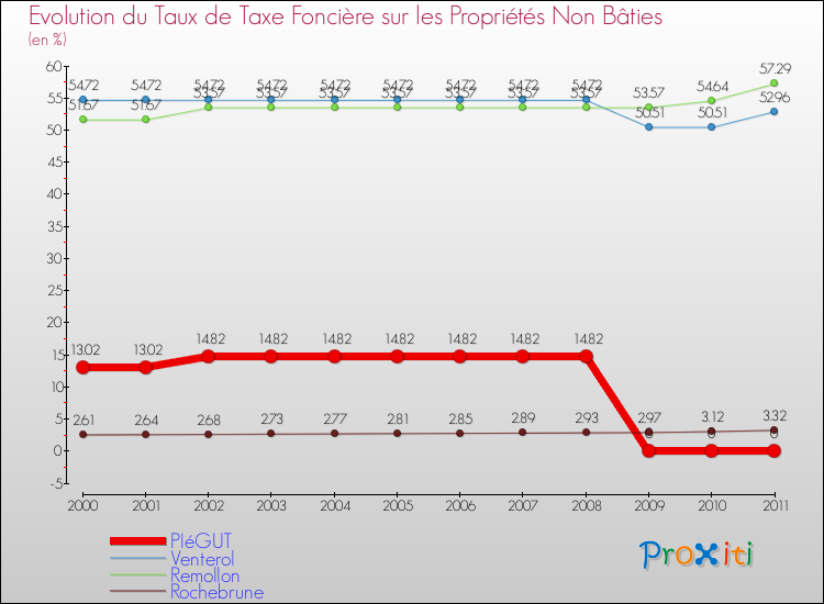 Pendant la même période, les communes françaises similaires à Piégut, ont vu leur taux de taxe foncière sur le non bâti baisser de 16.07 % en moyenne entre 2000 et 2011.
