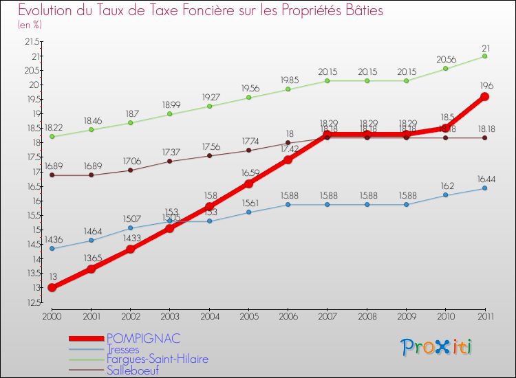 A Pompignac, le taux de taxe foncière sur le bâti a donc augmenté de 50.77 % entre 2000 et 2011.
