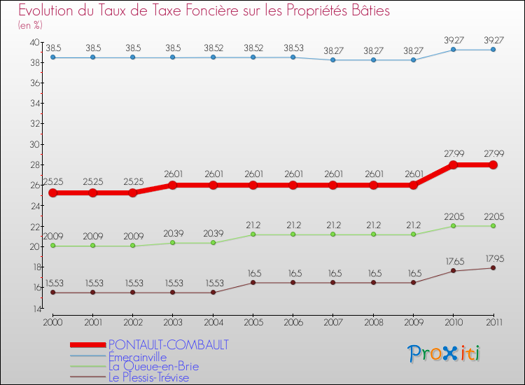 En 2011, le taux de la taxe foncière sur le bâti vôté par le conseil municipal de Pontault-Combault était de : 27.99 %.