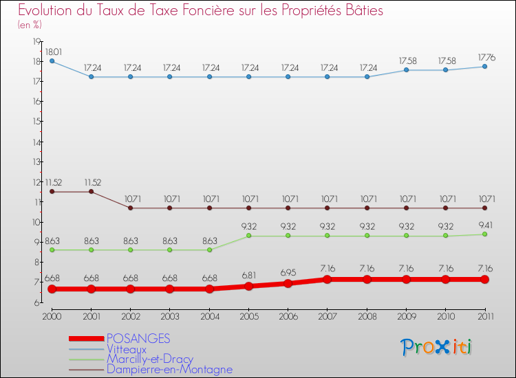 A Posanges, le taux de taxe foncière sur le bâti a donc augmenté de 7.19 % entre 2000 et 2011.