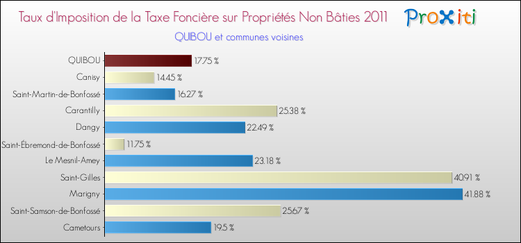 Vous trouverez ci-dessous des graphiques qui vous permettent de situer le taux de la taxe foncière sur le non bâti de Quibou par rapport aux communes voisines.