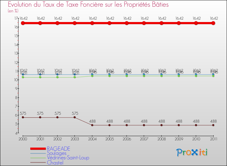 A Rageade, le taux de taxe foncière sur le bâti a donc augmenté de 0 % entre 2000 et 2011.