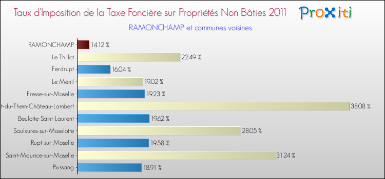 En 2011, le taux de la taxe foncière sur le non bâti vôté par le conseil municipal de Ramonchamp était de : 14.12 %.