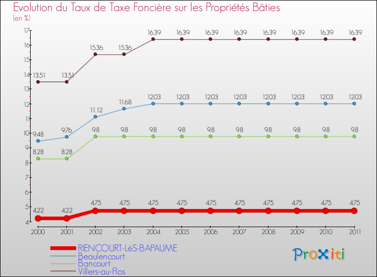 A Riencourt-lès-Bapaume, le taux de taxe foncière sur le bâti a donc augmenté de 12.56 % entre 2000 et 2011.