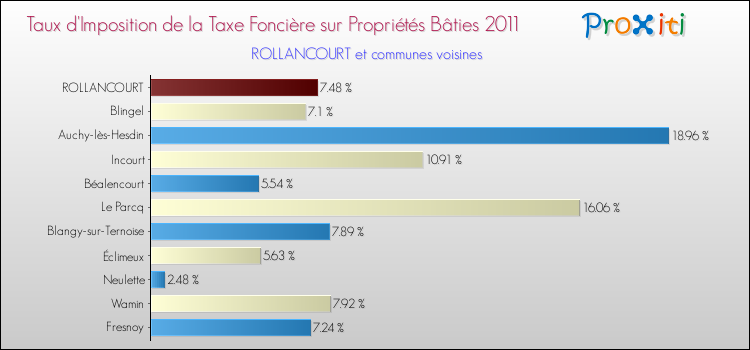 En 2011, le taux de la taxe foncière sur le bâti vôté par le conseil municipal de Rollancourt était de : 7.48 %.