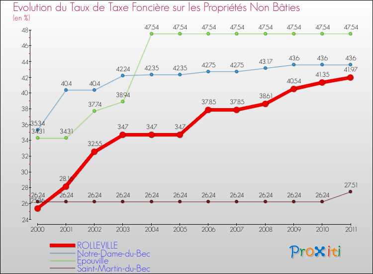 Pendant la même période, les communes françaises similaires à Rolleville, ont vu leur taux de taxe foncière sur le non bâti augmenter de 15.45 % en moyenne entre 2000 et 2011.