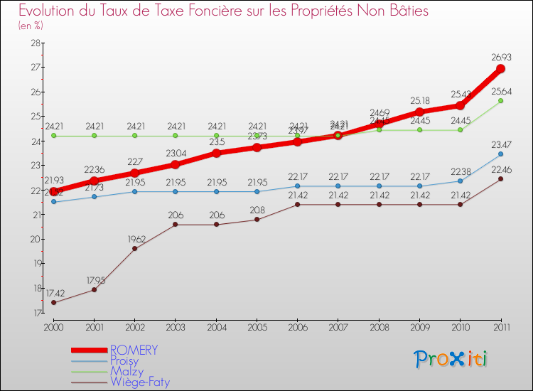 En 2011, le taux de la taxe foncière sur le non bâti vôté par le conseil municipal de Romery était de : 26.93 %.