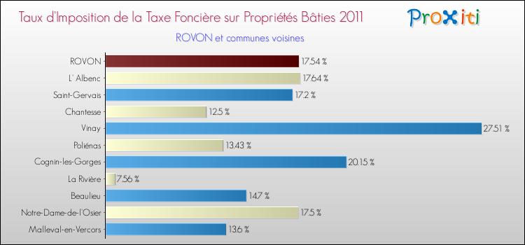 En 2011, le taux de la taxe foncière sur le bâti vôté par le conseil municipal de Rovon était de : 17.54 %.