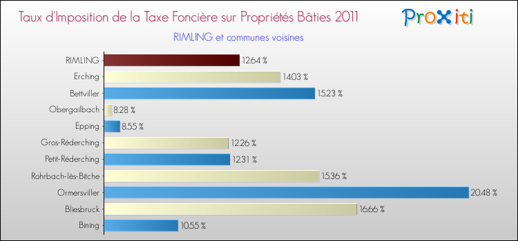 En 2011, le taux de la taxe foncière sur le bâti vôté par le conseil municipal de Rimling était de : 12.64 %.