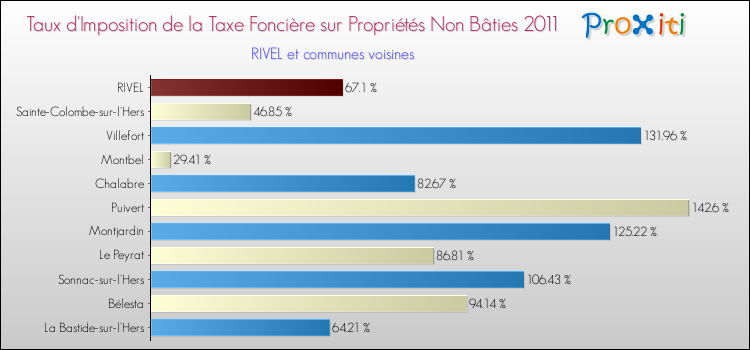 A noter : la valeur moyenne de ce taux de taxe foncière sur le non bâti dans les communes françaises similaires à Rivel était de 25.53 %, en 2011.