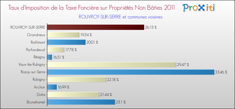En 2011, le taux de la taxe foncière sur le non bâti vôté par le conseil municipal de Rouvroy-sur-Serre était de : 26.13 %.