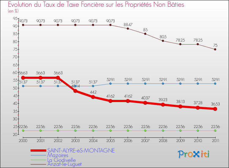 A Saint-Alyre-ès-Montagne, le taux de taxe foncière sur le non bâti a donc baissé de 35.49 % entre 2000 et 2011.