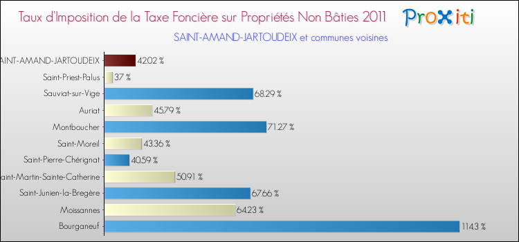 A noter : la valeur moyenne de ce taux de taxe foncière sur le non bâti dans les communes françaises similaires à Saint-Amand-Jartoudeix était de 38.55 %, en 2011.