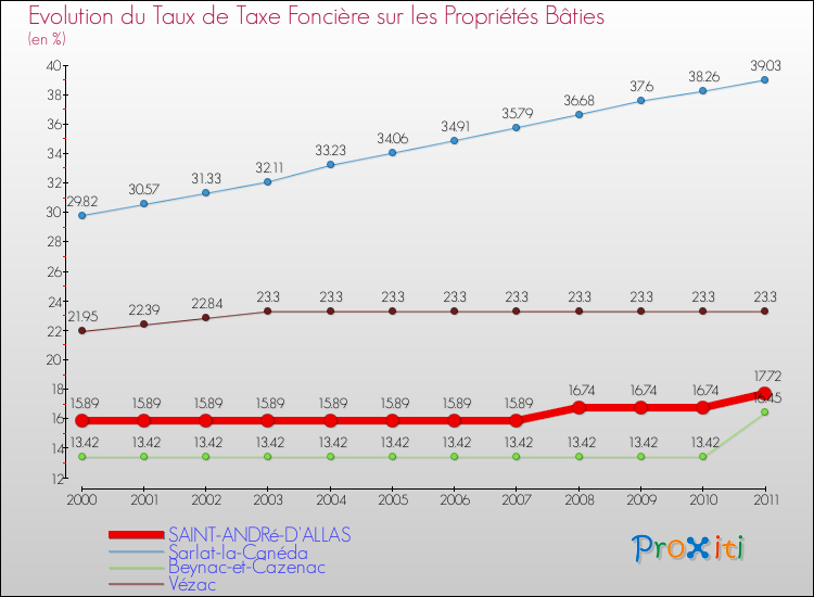 Pendant la même période, les communes françaises similaires à Saint-André-d'Allas, ont vu leur taux de taxe foncière sur le bâti augmenter de 23.3 % en moyenne entre 2000 et 2011.