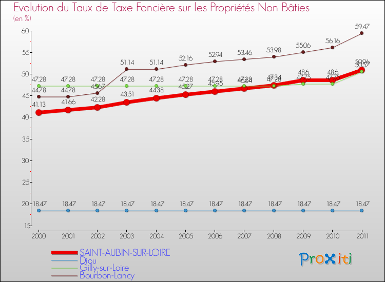 A Saint-Aubin-sur-Loire, le taux de taxe foncière sur le non bâti a donc augmenté de 23.9 % entre 2000 et 2011.