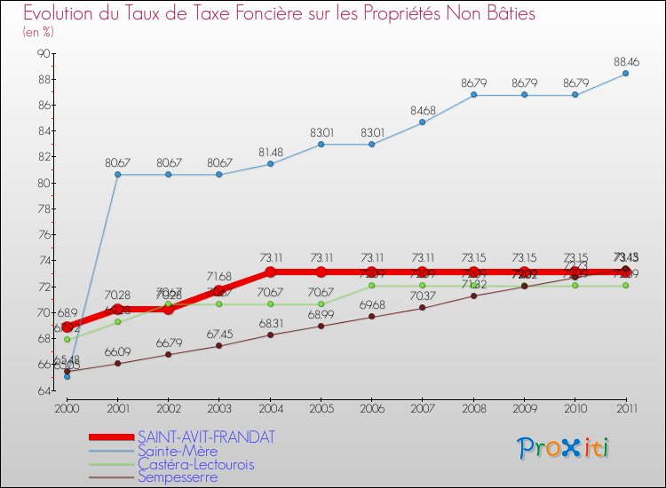 Pendant la même période, les communes françaises similaires à Saint-Avit-Frandat, ont vu leur taux de taxe foncière sur le non bâti augmenter de 26.73 % en moyenne entre 2000 et 2011.