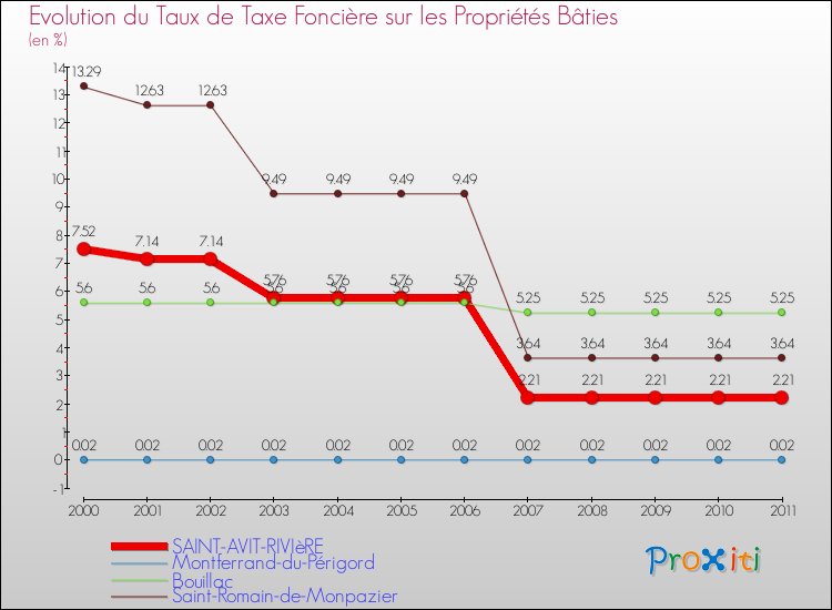 A Saint-Avit-Rivière, le taux de taxe foncière sur le bâti a donc baissé de 70.61 % entre 2000 et 2011.